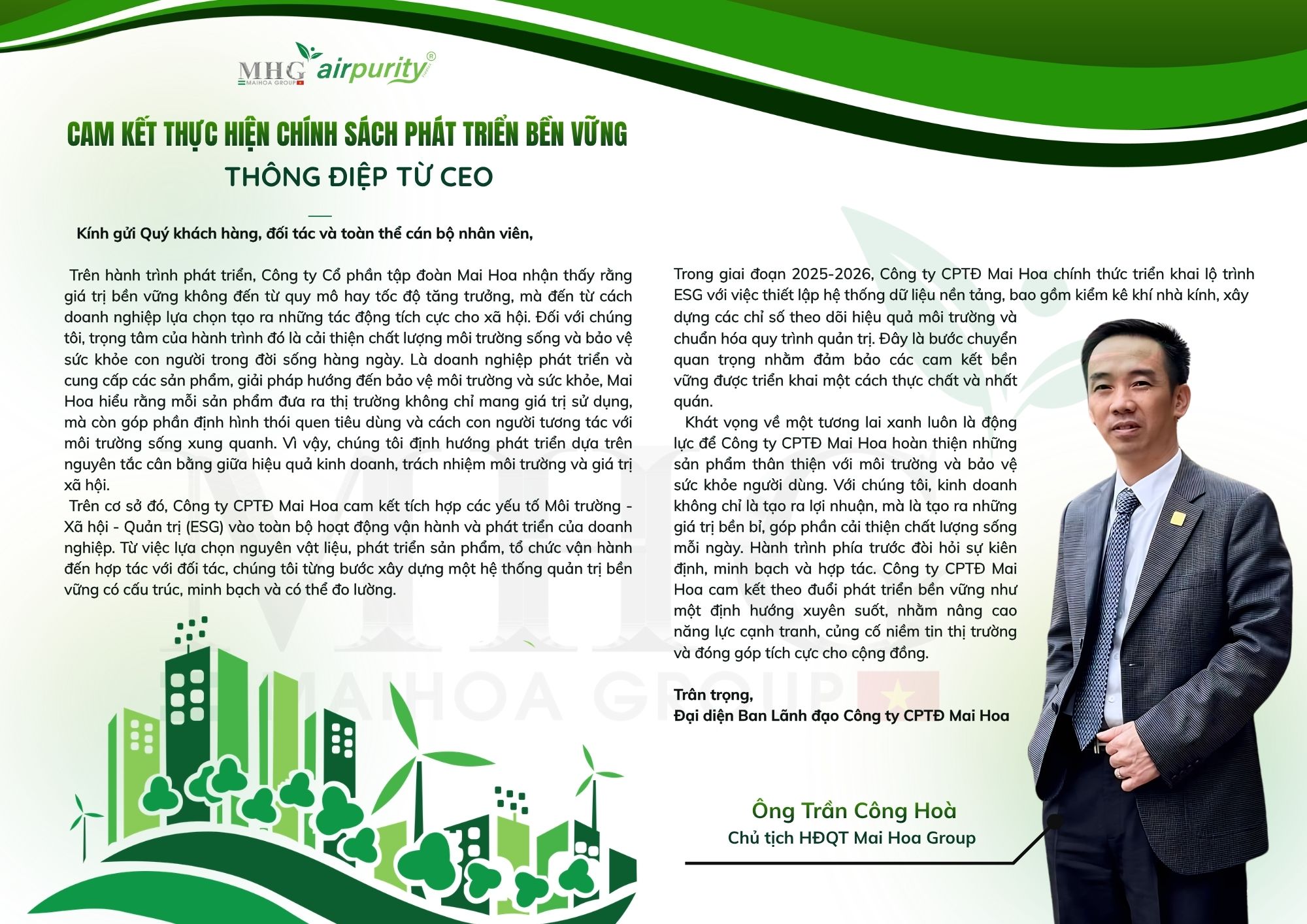 Chúng tôi nhìn nhận sự bền vững là kết quả của một quá trình tích lũy lâu dài, đòi hỏi tinh thần trách nhiệm và kỷ luật thực thi cao độ. Ban Phát triển Bền vững cam kết hiện thực hóa mọi định hướng chiến lược thành các kết quả có thể đo lường và rà soát định kỳ. Công ty CPTĐ Mai Hoa tin rằng giá trị của doanh nghiệp không chỉ nằm ở sản phẩm cung cấp, mà ở khả năng tạo ra những tác động tích cực và lâu dài đối với môi trường và xã hội. Đây là định hướng mà chúng tôi kiên định theo đuổi trong toàn bộ hành trình phát triển.